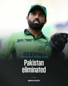 آئی سی سی چیمپئنز ٹرافی میں پاکستان کا سفر شروع ہوتے ہی اختتام پذیر ہوگیا اور ٹورنامنٹ میں مسلسل دو شکستوں کے ساتھ چھٹے روز ہی پاکستان کا سفر تمام ہوگیا۔
