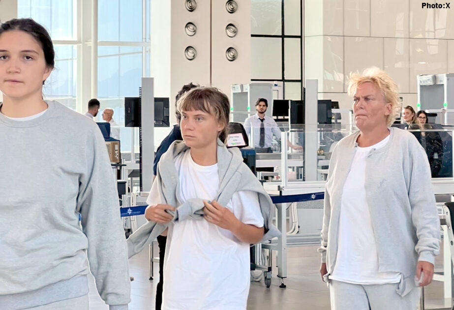 بیان کے ساتھ شیئر کی گئی تصاویر میں گریٹا تھیونبرگ کو دو دیگر خواتین کے ہمراہ تل ابیب کے بین گوریون انٹرنیشنل ایئرپورٹ سے گزرتے ہوئے دکھایا گیا ہے۔ تینوں خواتین اسرائیلی جیلوں میں استعمال ہونیوالے سرمئی رنگ کے ٹریک سوٹ پہنے ہوئے نظر آئیں۔اسرائیلی وزارتِ خارجہ نے اے ایف پی کو بتایا کہ گلوبل صمود فلوٹیلا کے 138 رضاکار ابھی تک اسرائیلی قید میں ہیں۔