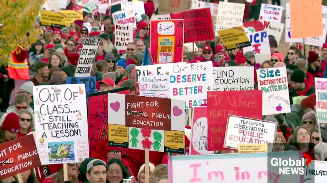 کیلگری (سی بی سی نیوز / سی ٹی وی / گلوبل نیوز) البرٹا میں ہزاروں اساتذہ اور عوامی تعلیم کے حامی ہفتے کے روز صوبائی وزیرِ تعلیم دیمیٹریوس نیکولائیڈیز کے حلقے کیلگری بو میں جمع ہوئے، جہاں انہوں نے حکومت کی متوقع “بیک ٹو ورک” قانون سازی کے خلاف شدید احتجاج کیا۔