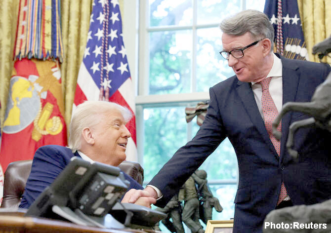 تصویر میں امریکی صدر ڈونلڈ ٹرمپ کو 8 مئی کو وائٹ ہاؤس میں پیٹر مینڈلسن سے مصافحہ کرتے دیکھا جا سکتا ہے۔ ٹرمپ کو بھی ایپسٹین سے تعلقات پر سوالات کا سامنا ہے اور وائٹ ہاؤس نے اس مبینہ خط کو مسترد کیا ہے جو ٹرمپ کی طرف سے ایپسٹین کے لیے لکھے جانے کا دعویٰ کیا جا رہا تھا۔