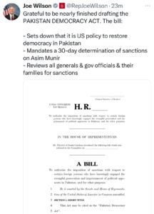 کانگریس مین جو ولسن نے “پاکستان ڈیموکریسی ایکٹ” کے نام سے ایک بل پیش کرنے کا اعلان بھی کیا ہے، جو پاکستان کے چیف آف آرمی اسٹاف سمیت ان افراد پر پابندیاں عائد کرنے کا مطالبہ کرتا ہے جو جمہوری عمل میں مداخلت کے ذمہ دار ہیں۔