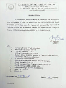 انجینئر محمد رمضان بٹ تین سال کیلۓ لیسکو کے چیف ایگزیکٹو آفیسر مقرر