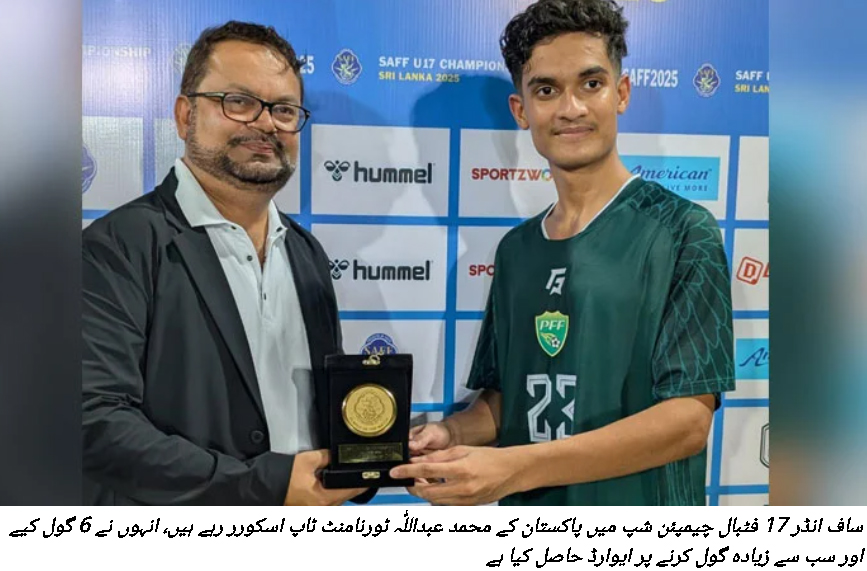 کولمبو (اسپورٹس ڈیسک)بھارت نے بنگلادیش کو فائنل میں پینلٹی ککس پر شکست دے کر ساف انڈر 17 فٹبال چیمپئن شپ اپنے نام کر لی۔ پاکستان کے محمد عبداللّٰہ ٹورنامنٹ کے ٹاپ اسکورر قرار پائے۔