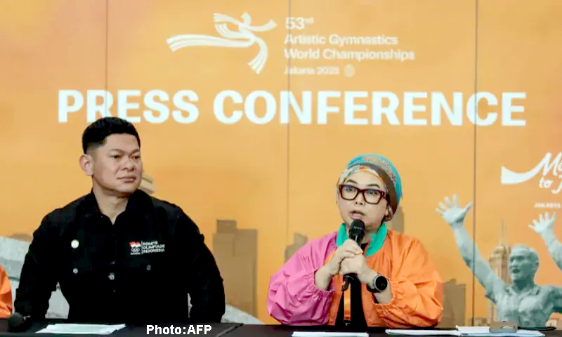 انڈونیشین جمناسٹکس فیڈریشن کی صدر ایتا یولیاتی اور انڈونیشین اولمپک کمیٹی کے سربراہ راجا سپتا اوکتوہاری نے 10 اکتوبر 2025 کو جکارتہ کے انڈونیشیا ایرینا میں 53ویں آرٹسٹک جمناسٹکس ورلڈ چیمپئن شپ سے قبل ایک پریس کانفرنس میں شرکت کی۔