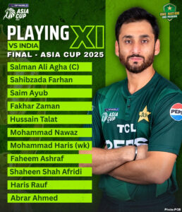 دبئی انٹرنیشنل کرکٹ اسٹیڈیم میں کھیلے گئے ایشیا کپ کے فائنل میں بھارت نے ٹاس جیتنے کے بعد پاکستان کو پہلے بیٹنگ کی دعوت دی۔ پاکستان کی ٹیم 19.1 اوورز میں 146 رنز بنا کر آؤٹ ہوگئی۔ ٹاپ آرڈر بیٹر صاحبزادہ فرحان نے 35 گیندوں پر 57 رنز کی شاندار اننگز کھیلی جبکہ فخر زمان نے 35 گیندوں پر 46 رنز اسکور کیے۔ دیگر بلے باز بھارتی باؤلرز کا جم کر مقابلہ نہ کرسکے۔ صائم ایوب 14، کپتان سلمان علی آغا 8 اور محمد حارث بغیر رن بنائے آؤٹ ہوئے۔