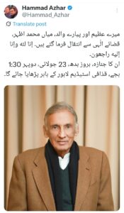 لاہور(وقائع نگار خصوصی)سابق گورنر پنجاب،سابق مئیراور این اے 129 سے رکن قومی اسمبلی منتخب ہونیوالے پاکستان تحریک انصاف کے رہنما میاں اظہر انتقال کر گئے،نمازجنازہ آج دوپہر01:30بجے قذافی سٹیڈیم کے باہراداکی جائے گی. میاں اظہر تحریک انصاف کے رہنما حماد اظہر کے والد تھے۔2024ء میں حماد اظہر کے کاغذات نامزدگی مسترد ہونے پر میاں اظہر نے عام انتخابات میں حصہ لیا ۔