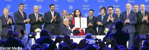تقریب سے خطاب کرتے ہوئے امریکی صدر ڈونلڈ ٹرمپ نے کہا کہ مشرق وسطیٰ میں پائیدار امن کیلئےکوشاں ہیں اور امن کی کوششوں کی کامیابی کیلئےپُرامید ہیں۔ انہوں نے کہا کہ غزہ امن بورڈ میں بہت سے ممالک شامل ہونا چاہتے ہیں اور بورڈ میں شمولیت پر تمام ممالک کے شکر گزار ہیں۔