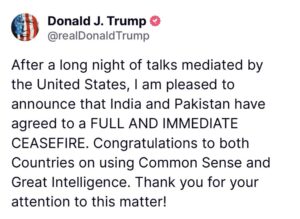 ڈونلڈ ٹرمپ نے کہا کہ بھارت اور پاکستان نے مکمل اور فوری جنگ بندی پر رضا مندی ظاہر کر دی، پاکستان اور بھارت نے ہوش مندی اور دانشمندی کا مظاہرہ کیا۔امریکی وزیرخارجہ کا اس حوالے سے کہنا ہے کہ پاکستان اوربھارت وسیع تر مسائل پر کسی غیرجانبدار مقام پر مذاکرات کریں گے۔