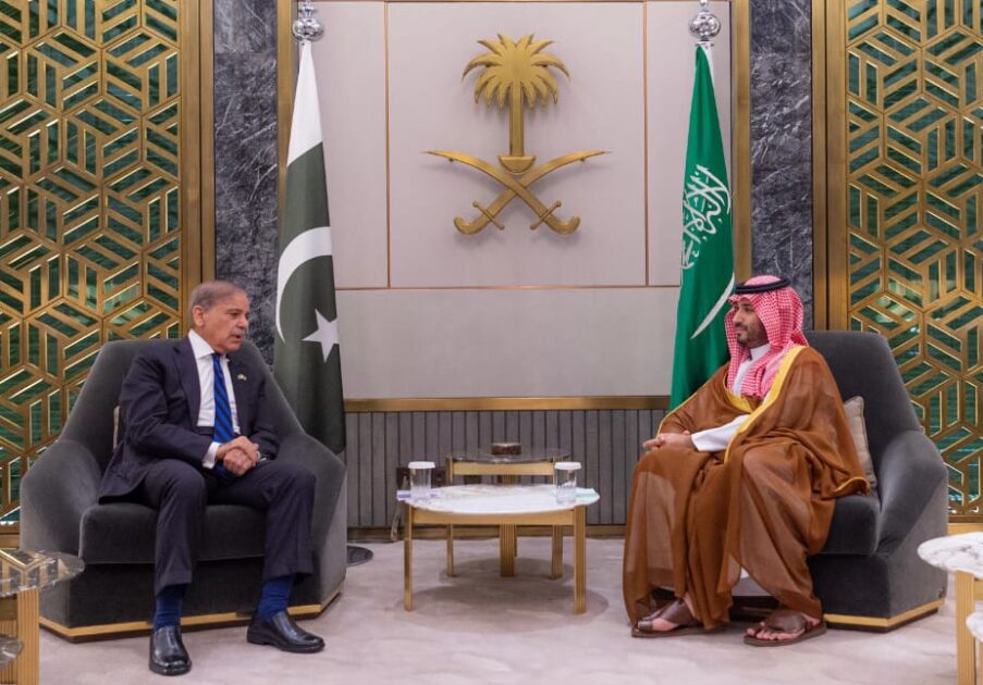 سرکاری خبر رساں ادارے اے پی پی کے مطابق پی ایم آفس کے میڈیا ونگ سے جاری بیان میں کہا گیا ہے کہ وزیر اعظم محمد شہباز شریف نے سعودی عرب کے ولی عہد اور وزیر اعظم شہزادہ محمد بن سلمان سے ملاقات کی، اس موقع پر نائب وزیر اعظم و وزیر خارجہ اسحٰق ڈار، آرمی چیف جنرل سید عاصم منیر اور وزیر اعلیٰ پنجاب مریم نواز بھی موجود تھیں۔