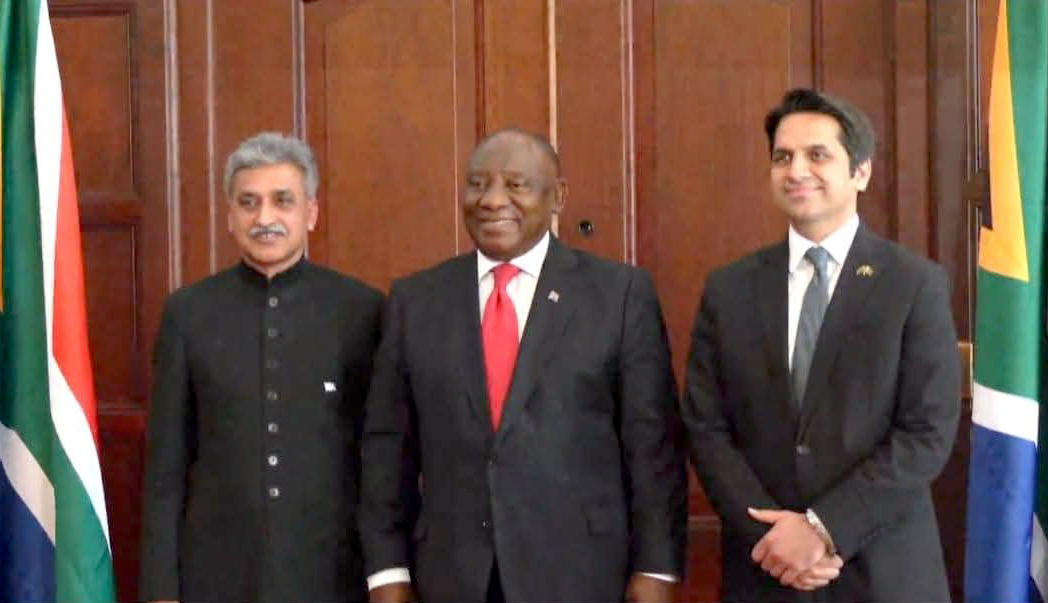 جوہانسبرگ(فلک شیر سے) — جنوبی افریقہ میں تعینات پاکستانی ہائی کمشنر ملک محمد فاروق اور ڈپٹی ہائی کمشنر ڈاکٹر حسن محمد ربانی نے صدر سِرل رامافوسا سے اہم ملاقات کی۔ یہ ملاقات ملک محمد فاروق کی بطور ہائی کمشنر تعیناتی کے بعد صدر کے ساتھ ان کی پہلی باضابطہ ملاقات تھی۔