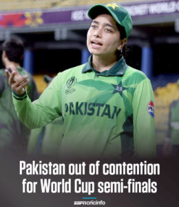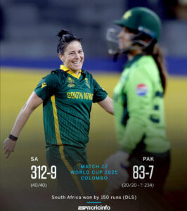 کولمبو (سپورٹس ڈیسک) – ویمنز کرکٹ ورلڈکپ کے بارش سے متاثرہ 22ویں میچ میں جنوبی افریقہ ویمنز نے پاکستان ویمنز کو ڈک ورتھ لوئس میتھڈ کے تحت 150 رنز سے شکست دے دی، جس کے بعد گرین شرٹس کا ورلڈکپ میں سفر اختتام کو پہنچ گیا۔