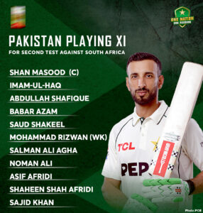 جنوبی افریقہ کی ٹیم میں بھی دو تبدیلیاں کی گئیں — مارکو جینسن اور کیشو مہاراج کو ویان ملڈر اور پرینیلائن سبرائن کی جگہ شامل کیا گیا۔یاد رہے کہ پاکستان نے سیریز کے پہلے میچ میں جنوبی افریقہ کو 93 رنز سے شکست دے کر 0-1 کی برتری حاصل کر رکھی ہے۔