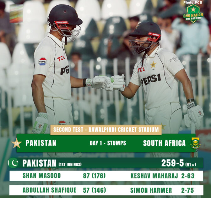 دن کے اختتام پر پاکستان نے 5 وکٹوں پر 259 رنز بنائے تھے، سعود شکیل 42 اور سلمان علی آغا 10 رنز پر ناٹ آؤٹ ہیں۔جنوبی افریقہ کی جانب سے سائمن ہارمر اور کیشو مہاراج نے دو، دو جبکہ کاگیسو ربادا نے ایک وکٹ حاصل کی۔