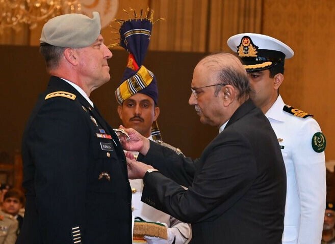 اسلام آباد ( نمائندہ خصوصی/ آئی ایس پی آر)صدرِ مملکت آصف علی زرداری نے امریکی سینٹرل کمانڈ کے سربراہ جنرل مائیکل ای کوریلا کو دفاعی تعلقات اور علاقائی سلامتی میں نمایاں خدمات کے اعتراف میں پاکستان کا اعلیٰ عسکری اعزاز “نشانِ امتیاز (ملٹری)” عطا کیا۔ یہ اعزاز ایوانِ صدر اسلام آباد میں ایک خصوصی تقریب کے دوران دیا گیا۔
