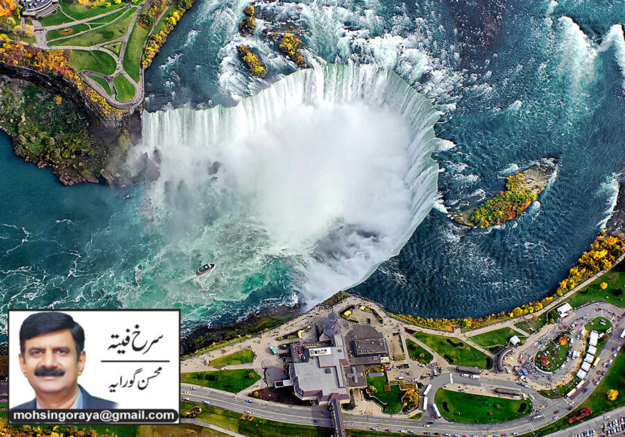 پاکستان سے کوئی دوست،رشتہ دار ٹورنٹو کینیڈا آئے تو اسکی سب سے پہلی خواہش نیاگرا فالز دیکھنا ہوتی ہے،وہ ٹورنٹو کا سی این ٹاور،ڈاؤن ٹاؤن بھی دیکھنا چاہتا ہے،میں ان دنوں کینیڈا میں ہوں، دوستوں کی میزبانی اور انہیں یہاں گھمانا پھرانا میرا فرض اولین ہے،میں خود کتنی دفعہ یہ سارے شاہکار دیکھ چکاہوں، اب یاد بھی نہیں۔لاہور سے میرے دوست عامر بٹ اور انکی اہلیہ،ہماری بھابی صا حبہ چند روز پہلے یہاں آئے تو سائٹ سین کی مشق ایک دفعہ پھر سے ہو گئی،سکین اکاونٹینسی کینیڈا کے مالک و مختار پیارے بھائی عامر قریشی نے ان کے اس وزٹ کے لئے مکمل تیاریاں بلکہ فیلڈنگ لگا رکھی تھی، کہاں لنچ،کہاں ڈنر اور کس کس مقام کی سیر،یعنی وہی اس ٹور کے ہوسٹ تھے آپ مجھے کو ہوسٹ کہ سکتے ہیں۔عامر بٹ اور بھابی نے ٹور کے آخر میں ناگرا فالز اور پھر نیاگرا فالز کے ہمسایہ میں واقع امریکہ کے بفلو ائیر پورٹ سے میامی اور پھر نیویارک جانا تھا،کو ہوسٹ کے ہاتھ میں ٹور کی ٹیل ہی آئی،سو میں مہمانوں کے ہمراہ نیاگرا فالز آ گیا،اس کا قدرتی حسن آپ کو سب کچھ بھلا دیتا ہے اور آپ تھوڑی دیر کے لئے خوابوں اور خیالوں کی وادی میں اتر جاتے ہیں، اپنے دکھ اور تکلیفیں بھول کر اس کے سکون میں کھو جاتے ہیں،اٹھلاتے پھرتے ہیں،،میں اڈی اڈی جاواں ہوا دے نال،، فالز کے نتیجے میں پانی سے اٹھنے والی ہلکی ہلکی پھوار میں پتہ ہی نہیں چل رہا تھا کہ اس وقت یہاں کا درجہ حرارت تیس ہے،یہ درجہ حرارت یہاں کے لحاظ سے بہت زیادہ ہے،مگر مسٹ کی وجہ سے ایک رومان پرور ماحول بنا ہوا ہے،دنیا کے ہر کونے سے تعلق رکھنے والے ہزاروں سیاح اس ماحول کو انجوائے کر رہے ہیں،ویسے تو اسے دنیا کا آٹھواں عجوبہ کہا جاتا ہے مگر اپنے رومان پرور ماحول کی وجہ سے اسے عالمی ہنی مون کیپیٹل کا نام بھی دیا گیا ہے۔جیسے لاہور کے بغیر پاکستان دیکھنے بارے کہا جاتا ہے، جنیں لہور نئیں تکیا جمیا نئیں،،اسی طرح نیاگرا فالز نہ دیکھیں تو کہا جاتا ہے اس نے کینیڈا نہیں دیکھا،یہ عجوبہ چونکہ گریٹرٹورنٹو کے قریب ہے،جہاں ہم رہتے ہیں، اس لئے گاہے گاہے قدرت کے اس حسین مقام کو نہ دیکھنا نا شکری کے زمرے میں آتا ہے،سو ایک دفعہ پھر، ہم ہیں،نیاگرا فالز ہیں اور پارٹی ہو رہی ہے۔