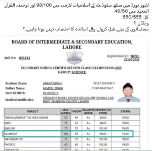 لاہور بورڈ کے امتحانات میں اسلامیات اور ترجمۂ قرآن جیسے مضامین میں غیر معمولی کامیابی حاصل کرنے والے سکھ طالب علم اونکار سنگھ نے ڈاکٹر بننے کی خواہش کا اظہار کیا ہے۔اونکار سنگھ اپنے والد ڈاکٹر منپال سنگھ کے نقشِ قدم پر چلنا چاہتے ہیں، جو شعبۂ طب میں نمایاں خدمات پر 2024 میں تمغۂ امتیاز حاصل کر چکے ہیں۔
