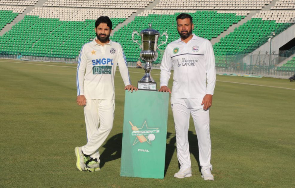 پریذیڈنٹ ٹرافی گریڈ ون 2025-26 کا فائنل اتوار سے واپڈا اور ایس این جی پی ایل کے درمیان قذافی سٹیڈیم میں کھیلا جائے گا۔پانچ روزہ میچ میں ایس این جی پی ایل کی قیادت محمد رضوان جبکہ واپڈا کی قیادت خالد عثمان کریں گے۔ ٹورنامنٹ جیتنے والی ٹیم ٹرافی اور 75 لاکھ روپے کی حقدار ہوگی۔
