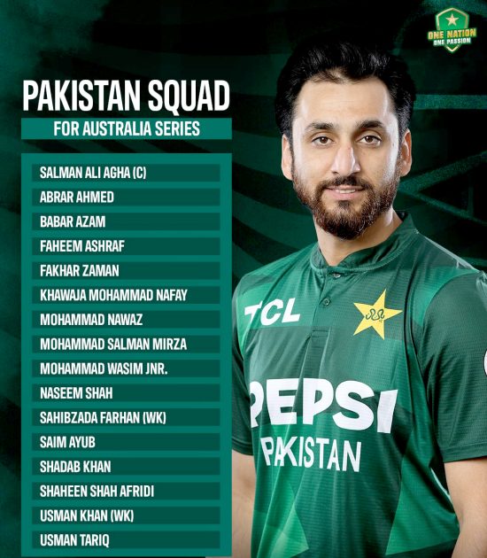 پاکستان کرکٹ بورڈ (پی سی بی) نے آسٹریلیا کے خلاف ٹی 20 سیریز کے لیے قومی سکواڈ کا اعلان کر دیا۔ٹی 20 سیریز کے لیے پاکستانی کرکٹ ٹیم کی قیادت سلمان علی آغا کریں گے جب کہ بابر اعظم اور شاہین شاہ آفریدی کی ٹی ٹوئنٹی ٹیم میں واپسی ہوئی ہے۔