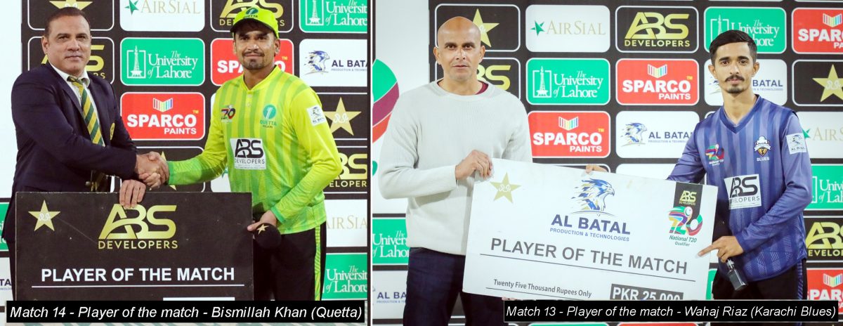جواب میں کراچی بلوز نے کپتان غازی غوری کے 37 گیندوں پر 50 رنز کی بدولت ہدف 19 ویں اوور میں حاصل کر لیا۔عثمان رحیم نے 19 گیندوں پر 33 جبکہ پلیئر آف دی میچ وہاج ریاض نے 12 گیندوں پر ناقابل شکست 15 رنز بنائے۔آزاد جموں کشمیر کی جانب سے فیضان سلیم کی تین وکٹیں۔ ساتویں راؤنڈ کے دوسرے میچ میں کوئٹہ کی ٹیم نے لاڑکانہ کے خلاف 62 رنز کی اہم فتح حاصل کی۔