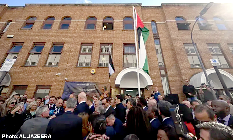 لندن/غزہ (الجزیرہ، بی بی سی، نمائندہ خصوصی) – برطانیہ کی جانب سے باضابطہ طور پر فلسطینی ریاست کو تسلیم کیے جانے کے بعد وسطی لندن میں فلسطینی مشن کو سفارتخانے کا درجہ دے دیا گیا اور اس موقع پر فلسطین کا پرچم بلند کیا گیا۔