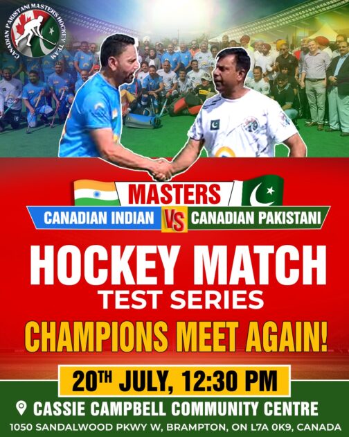 برامپٹن، اونٹاریو(نمائندہ خصوصی) ہاکی کے شائقین کیلئےایک سنسنی خیز مقابلے کی تیاریاں عروج پر ہیں جہاں کینیڈین انڈین اور کینیڈین پاکستانی ماسٹرز ہاکی ٹیمیں ایک یادگار ٹیسٹ سیریز کیلئےمیدان میں اترنے کو تیار ہیں۔ یہ مقابلہ 20 جولائی کو دوپہر 12:30 بجے کاسی کیمبل کمیونٹی سینٹر، 1050 سینڈل ووڈ پارک وے ویسٹ، بریمپٹن، اونٹاریو، L7A 0K9، کینیڈا میں منعقد ہوگا۔