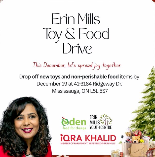 مسی ساگا، اونٹاریو (نمائندہ خصوصی) ایرن ملز یوتھ سینٹر، ایڈن فوڈ فار چینج، اور ممبر آف پارلیمنٹ مسی ساگا-ایرن ملز، اقراء خالد مل کر اس دسمبر میں ‘ایرن ملز ٹوائے اینڈ فوڈ ڈرائیو’ کا انعقاد کر رہے ہیں۔ اس مہم کا مقصد مقامی کمیونٹی میں خوشیاں پھیلانا ہے۔