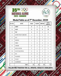 نیشنل گیمز:پاکستان آرمی نے سونے کے 20 میڈل جیت لئے