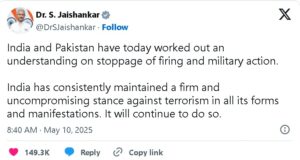 سماجی رابطےکی ویب سائٹ ایکس پر ٹویٹ کرتے ہوئے جے شنکر کا کہنا تھا کہ دونوں ممالک نے فوجی کارروائی روکنے پر مفاہمت کی ہے۔