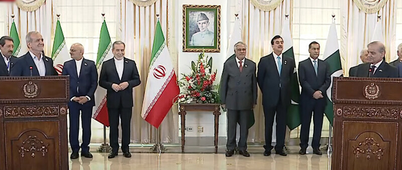 اسلام آباد میں ایرانی صدر مسعود پزشکیان کے دورہ پاکستان کے دوران منعقدہ مشترکہ پریس کانفرنس سے خطاب کرتے ہوئے وزیراعظم شہباز شریف نے کہا کہ ایران پاکستان کا برادر اسلامی ملک ہے اور دونوں ممالک کے عوام تاریخی، مذہبی اور ثقافتی رشتوں میں جڑے ہوئے ہیں۔ انہوں نے کہا کہ ایران کو پرامن مقاصد کیلئےجوہری طاقت حاصل کرنے کا مکمل حق حاصل ہے اور پاکستان اس اصولی مؤقف پر ایران کے ساتھ کھڑا ہے۔