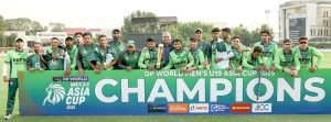 دبئی ( آئی سی سی، غیر ملکی میڈیا، مقامی ذرائع)پاکستان نے انڈر 19 ایشیا کپ کے فائنل میں شاندار کارکردگی کا مظاہرہ کرتے ہوئے روایتی حریف اور فیورٹ سمجھی جانے والی بھارتی ٹیم کو 191 رنز کے بھاری مارجن سے شکست دے کر ٹائٹل اپنے نام کر لیا۔ آئی سی سی اکیڈمی گراؤنڈ دبئی میں کھیلے گئے فائنل میں پاکستان نے پہلے بیٹنگ کرتے ہوئے 8 وکٹوں کے نقصان پر 347 رنز بنائے جو انڈر 19 ایشیا کپ فائنلز کی تاریخ کا سب سے بڑا مجموعہ ہے۔