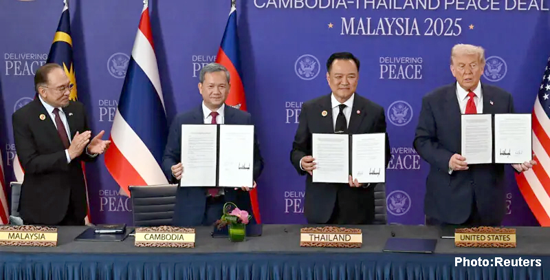 خبر رساں ادارے رائٹرز کے مطابق، تھائی لینڈ اور کمبوڈیا کے رہنماؤں نے امریکی صدر کی موجودگی میں ایک جامع جنگ بندی معاہدے پر دستخط کیے۔ ٹرمپ نے جولائی میں مداخلت کر کے دونوں ممالک کے پانچ روزہ سرحدی تنازع کو ختم کرنے میں کردار ادا کیا تھا۔