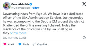 چیف منسٹر عمر عبداللہ نے سوشل میڈیا ایکس پر راجوری قصبے میں ایڈیشنل ڈپٹی کمشنر راج کمار تھاپا کی پاکستان حملے میں ہلاکت کی تصدیق کردی۔