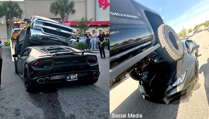 سوشل میڈیا پر سامنے آنے والی ویڈیو میں دیکھا جا سکتا ہے کہ لامبورگینی ڈرائیور گاڑی ریورس کر رہا تھا کہ اچانک ایک پک اپ ٹرک موڑ کاٹتے ہوئے اس کی گاڑی پر چڑھ گیا۔