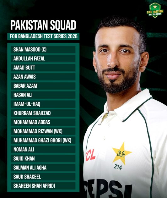 قومی سکواڈمیں شان مسعود (کپتان)، عبداللہ فضل،عماد بٹ، اذان اویس، بابر اعظم، حسن علی، امام الحق، خرم شہزاد، محمد عباس، محمد رضوان، محمد غازی غوری، نعمان علی، ساجد خان، سلمان علی آغا، سعود شکیل اور شاہین شاہ آفریدی بھی سکواڈ میں شامل ہیں۔ پاکستان اور بنگلا دیش کی ٹیموں کے درمیان پہلا ٹیسٹ میچ 8 مئی سے شیر بنگلا سٹیڈیم میں کھیلا جائے گا جب کہ دوسرا ٹیسٹ 16 مئی سے سلہٹ میں ہوگا اور یہ دونوں میچز آئی سی سی ورلڈ ٹیسٹ چیمپئن شپ کا حصہ ہیں۔