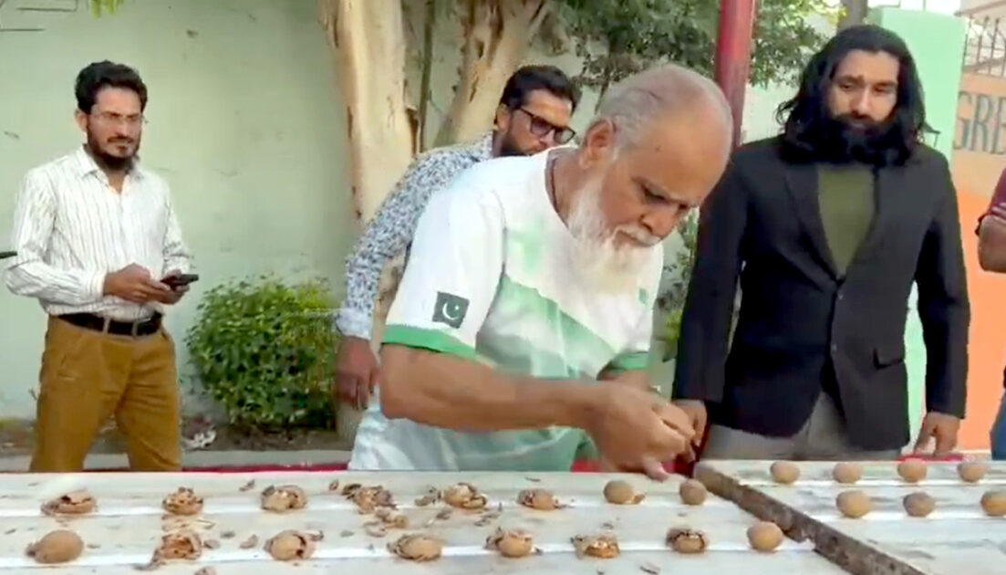 لاہور ( بیورو رپورٹ ) پاکستان کے 73 سالہ بزرگ نسیم الدین نے مکے کی مدد سے 163 اخروٹ توڑ کر دنیا کو حیرت میں ڈال دیا۔ گنیز ورلڈ ریکارڈ کی جانب سے ریکارڈ منظور کر لیا گیا ہے۔ نسیم الدین کو ایک منٹ میں 150 اخروٹ توڑنے تھے لیکن انہوں نے ٹیبل پر موجود تمام اخروٹ صرف 50 سیکنڈ میں ہی توڑ ڈالے۔ واضح رہے نسیم الدین کے پوتے محمد ابراہیم 6سال کی عمر میں ورلڈ ریکارڈ بنا چکے ہیں جبکہ بیٹا راشد نسیم اب تک 125 عالمی ریکارڈ پاکستان کےنام کر چکے ہیں۔ واضح رہے نسیم الدین ویلڈنگ کا کام کرتے ہیں اور لوہے کے دروازے اور کھڑکیاں بنانے میں مہارت رکھتے ہیں.
